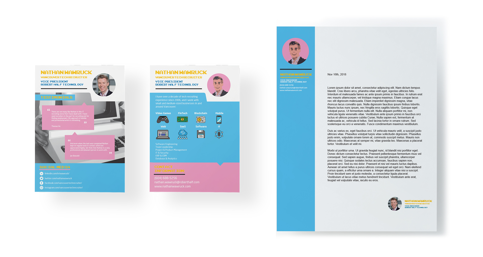 Printer half page flyer and letterhead for Nathan's personal branding. Both flyer and letterhead were also used as digital assets in the forms of PDFs.