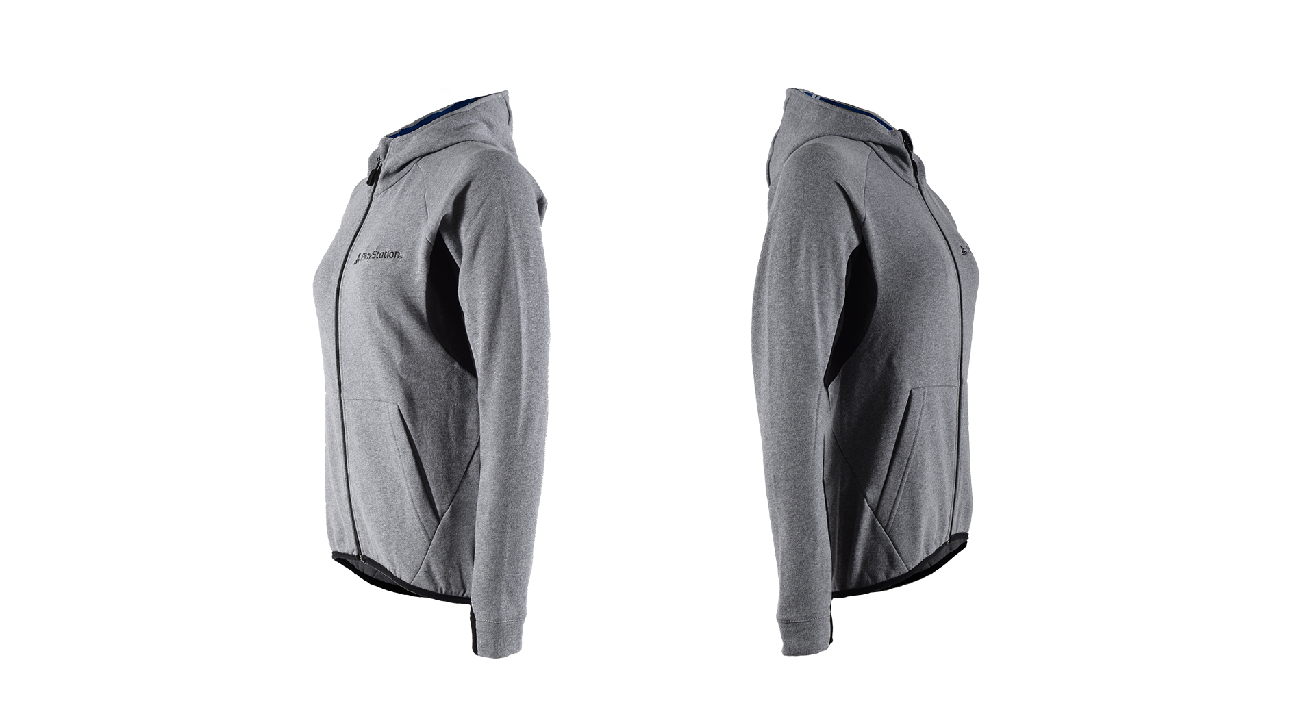 Line Drawings for heavyweight fleece hoodies. Ladies piece shown with sublimated hood liner and sleeve embroidery presented.