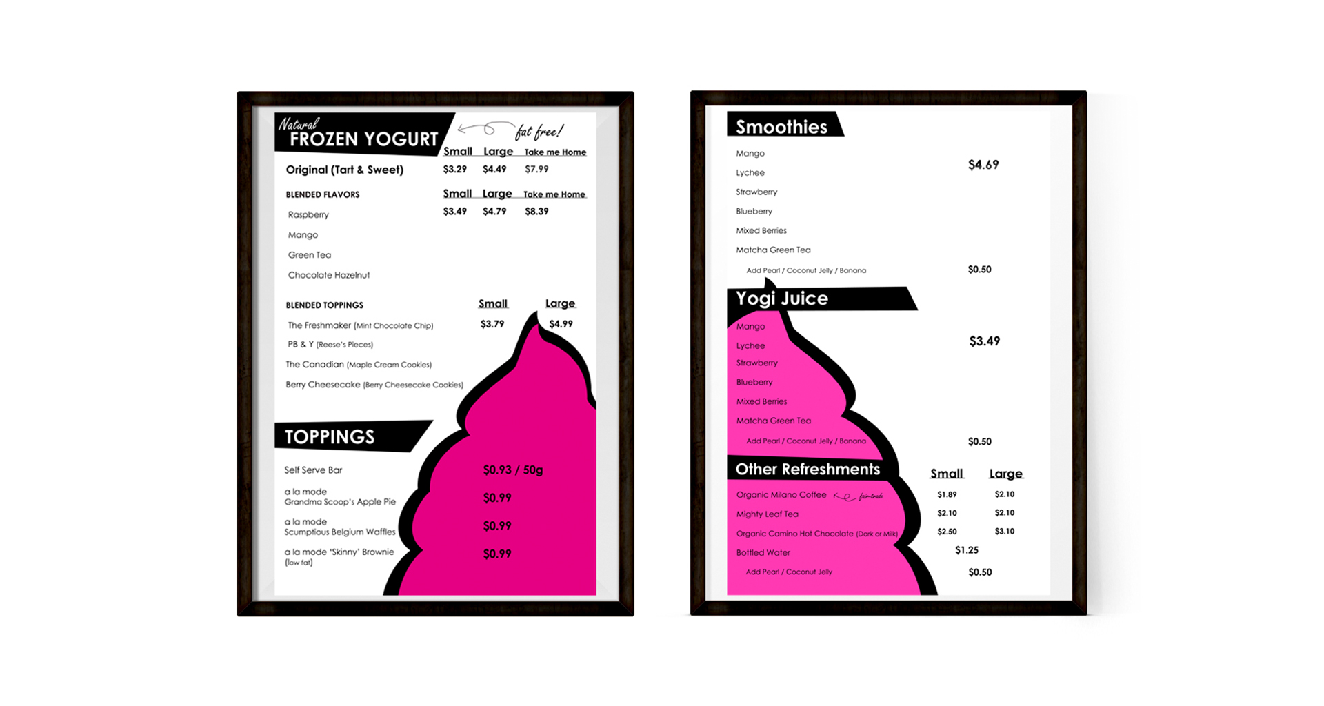 Scoop Frozen Yogurt was a branding project I acquired through my friend Mike and his sister Mary, the proprietors of Scoop Frozen Yogurt. Building on several pieces of collateral created by their previous graphic designer, I had to create new designs keeping with the company's current brand image. I chose to use the same pink and black color scheme as Scoop's previous designer to keep with their brand identity, to be fun, and light, which is what Frozen Yogurt is all about.