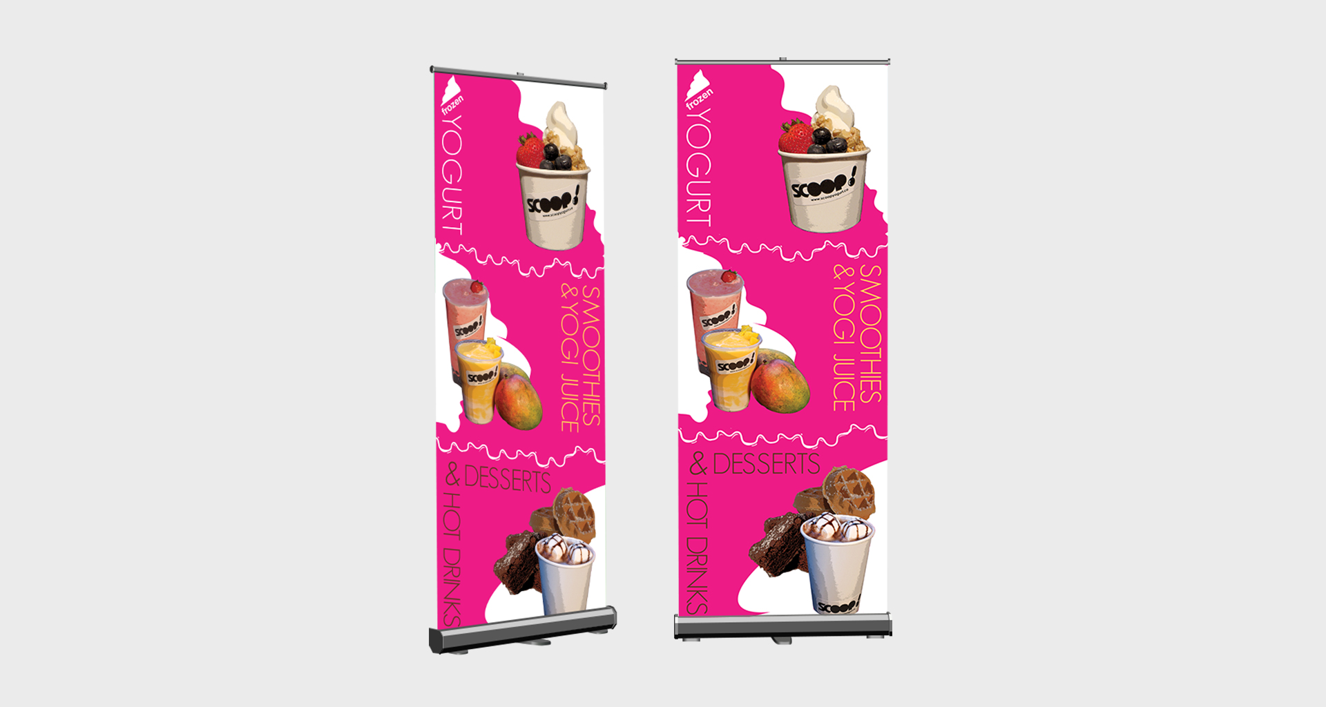 Final Vertical standing banner design for Scoop Frozen Yogurt, stood outside of their storefront to drive foot traffic in.